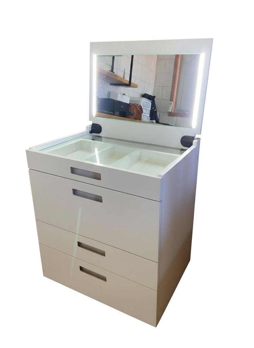 Como penteadeira, ele oferece espaço ideal para seus cuidados diários, com tampo amplo e compartimentos para maquiagens e acessórios.